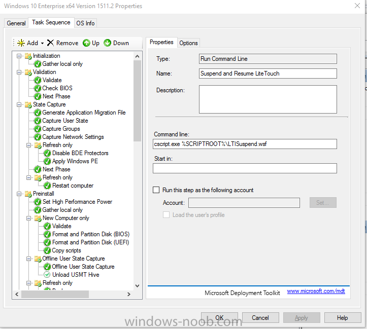 Hello, I'm still fairly new to enterprise image building and have only worked with custom Windows 10 images, nothing prior. That said, I had flawless Windows 10 images being PXE deployed up until Microsoft released the 1152 upgrade. After the 1152 upgrade my Window 10 deployment to a new computer went from 20-40 minutes up to 2-4 hours. The process hangs on the "Getting ready" and "Finalizing your settings" screens. Here is my smsts.log file link: http://s000.tinyupload.com/index.php?file_id=70776187637788550876 *You can see in the log the process hanging at 12:56pm and resuming at 2:50pm. OSDSetupHook.exe is where this process ALWAYS hangs. Tools I utilize to deploy images: Microsoft Deployment Toolkit (MDT 2013 Update 2), Microsoft Assessment and Deployment Kit, System Center Configuration Manager (SCCM 2012 R2 Version 1602) (5.0.8355.1306), Hyper-V Manager The steps I take to deploy images: 1. Download Windows 10 1152.2 from MS Volume Licensing website 2. Add Operating System into MDT and create new Standard Client Task Sequence 3. Add cscript.exe %SCRIPTROOT%\LTISuspend.wsf prior to the Imaging section of my MDT task sequence 4. Update DepolymentShare 5. Use the LiteTouchPE_x64.iso to boot a new Hyper-V and wait for the task sequence to hit the Suspend command. 6. While the image is suspended I manually add all the applications our company uses, disable telemtry, powershell script to rip out bloatware, install Office365ProPlus Click-to-run, create LayoutModification.xml for a custom start menu. 7. I will then create a Checkpoint named "Image prior to Sysprep" so I can revert to make changes or install updates. 8. Click the Resume Task Sequence to capture the .wim file 9. Upload the captured .wim into SCCM and tie it into a task sequence that formats and partitions the hard drive, pre-provisions BitLocker, applys the custom .wim operating system, applys the serial number, installs device specific drivers, joins the domain, installs Configuration Manager Client, installs MBAM 2.5 SP1 client, installs updates, applys group policy, and enables BitLocker The issue is that during the SCCM task sequence, prior to installing the Configuration Manager Client, the process hangs on the "Getting ready" and "Finalizing your settings" screens. It will stay on here for 2-4 hours until the task sequence bar returns and finishes the last 4 steps. I've tried countless tips, tricks, different installation methods, etc trying to get the image back down to a reasonable install time. I have even deployed an image with no configuration changes or additional software installed, a default Windows 10 image, and it still takes hours to deploy. If anyone has some insight or has a better deployment method, I would love to get the communities opinion. I have attached screenshots of the MDT and SCCM task sequences. I can also post anything else you guys request. Thanks!